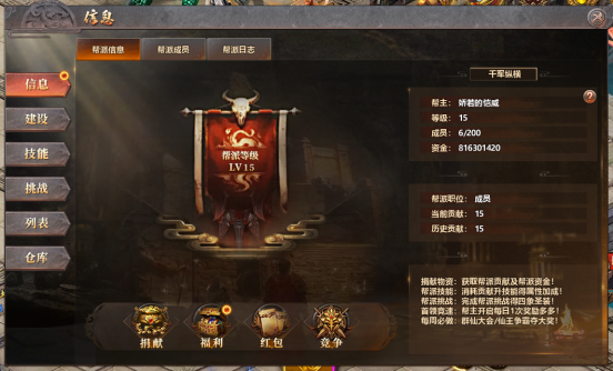 4、帮派建设:升级帮派建筑,可升级帮派玩法和活动收益等级,获得更高收益。