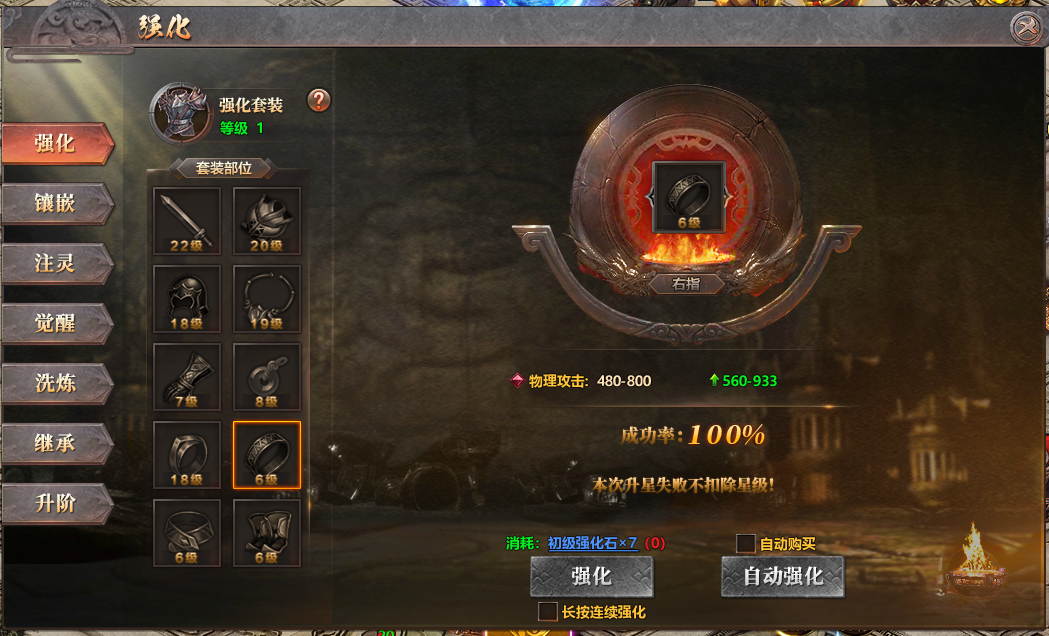 1、装备强化:已穿戴装备的部位可以强化,强化提升装备部位的锻造等级,获得属性成长。强化难度逐渐提升,高级强化有一定的失败率。