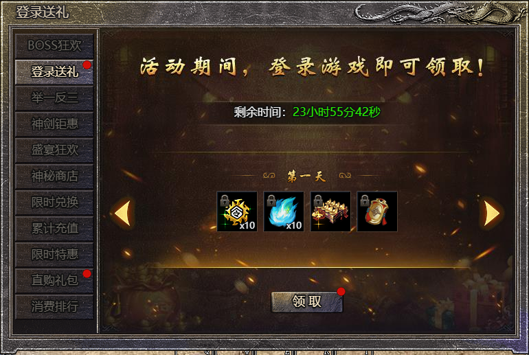 1.活动期间,玩家每天登录游戏,可以在活动界面中领取一份奖励;