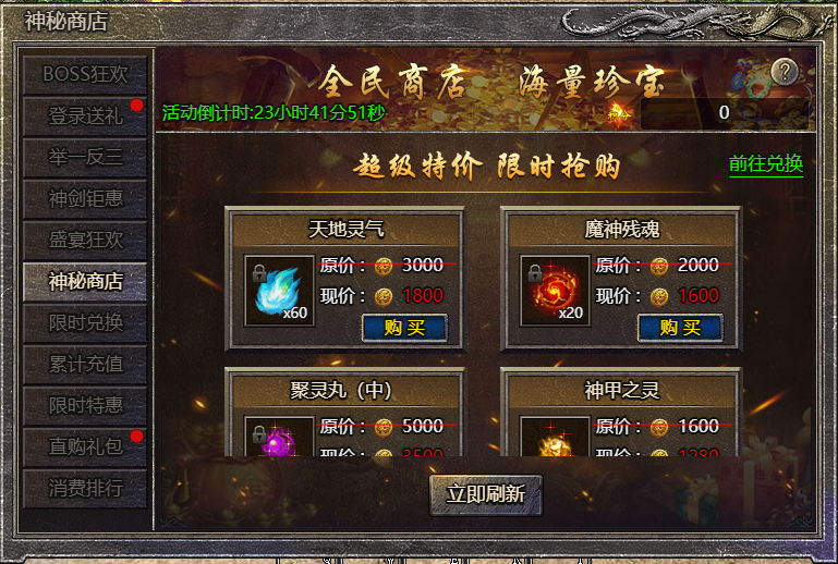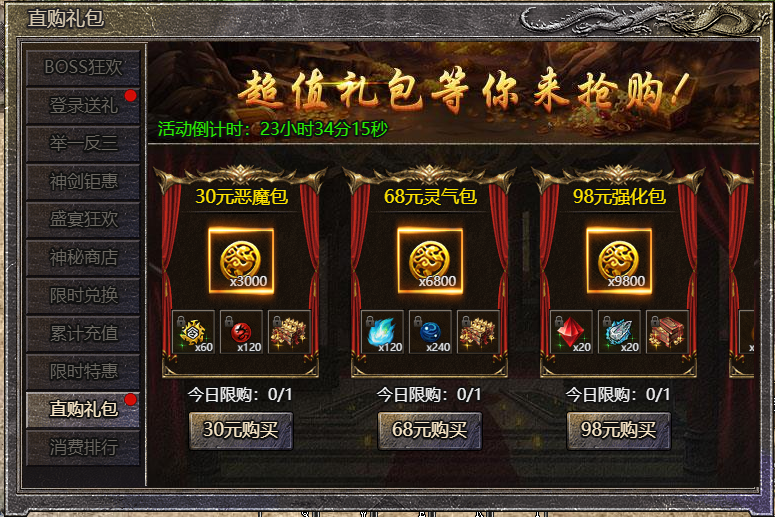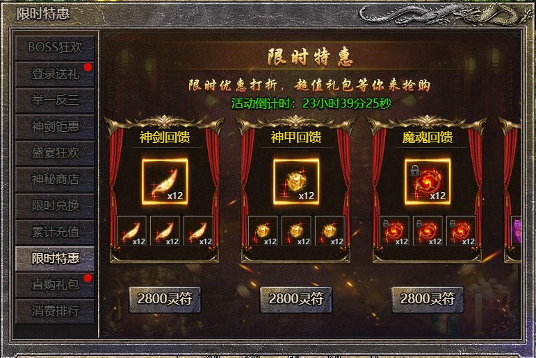 1.活动期间,玩家可在活动面板购买限购礼包,神剑特惠、神甲特惠、魔魂特惠、徽记特惠、经脉特惠、神阶特惠、荒古特惠