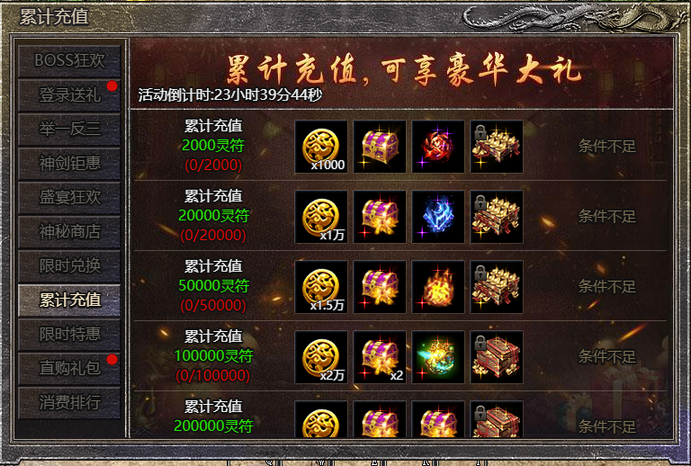 1.活动期间,每充值一定的灵符可领取一份奖励;
