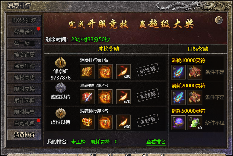 1.活动期间,玩家消耗灵符数量累计达到指定数量即可参与冲榜;
