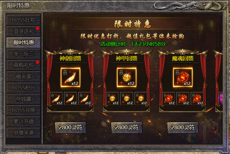 1.活动期间,玩家可在活动面板购买限购礼包,神剑特惠、神甲特惠、魔魂特惠、徽记特惠、经脉特惠、神阶特惠、荒古特惠