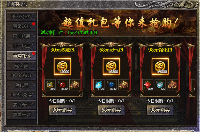 3.活动礼包每天只可购买1次,期间每天重置;