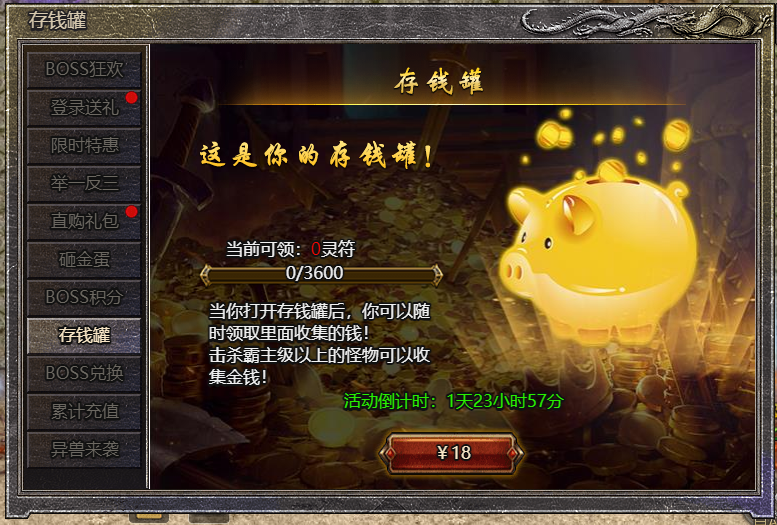 1.活动期间每次击杀霸主级以上怪物可以收集金钱。