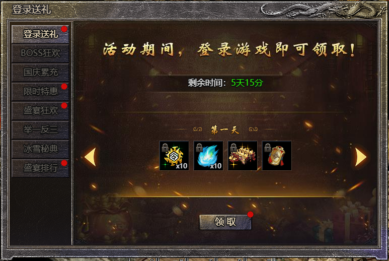 1.活动期间,玩家每天登录游戏,可以在活动界面中领取一份奖励;