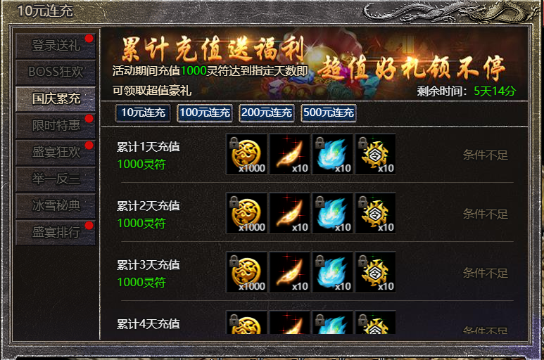 1.活动期间,每充值一定的灵符可领取一份奖励;