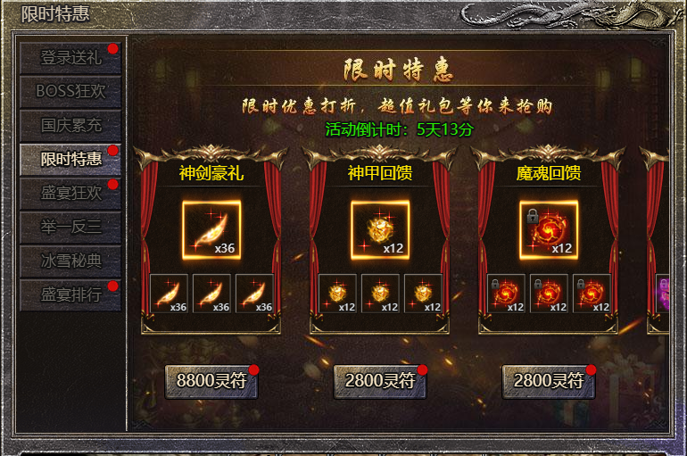 1.活动期间,玩家可在活动面板购买限购礼包,神剑特惠、神甲特惠、魔魂特惠、徽记特惠、经脉特惠、神阶特惠