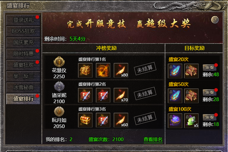 1.活动期间,玩家盛宴次数累计达到指定数量即可参与冲榜;