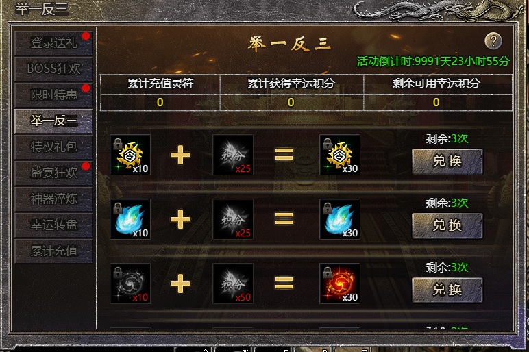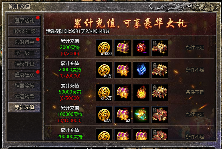 1.活动期间,每充值一定的灵符可领取一份奖励;