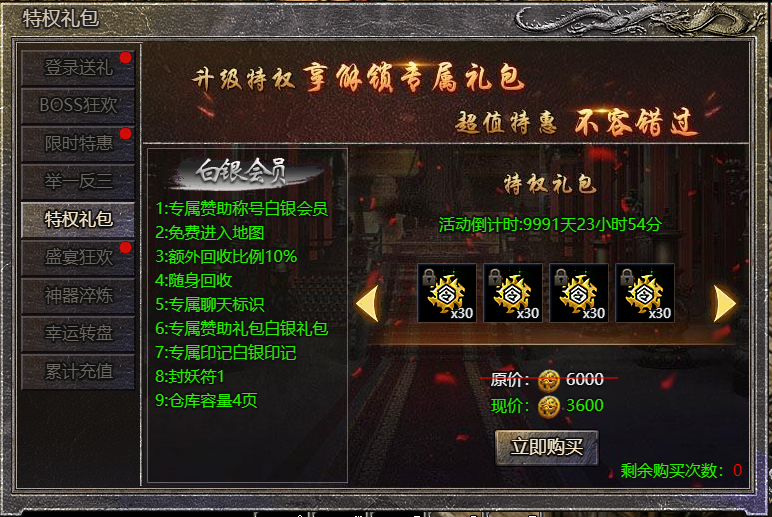 1.活动期间,玩家可在活动面板购买限购礼包,拥有对应的赞助特权,才能购买对应的礼包哦