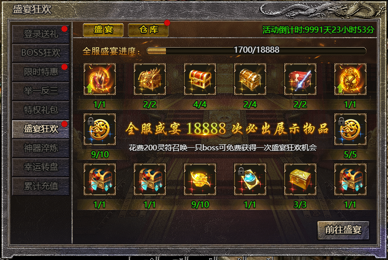 3.全服盛宴18888次必出全部展示物品,数量有限,先到先得