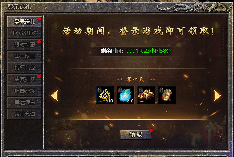 1.活动期间,玩家每天登录游戏,可以在活动界面中领取一份奖励;