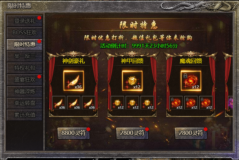 1.活动期间,玩家可在活动面板购买限购礼包,神剑特惠、神甲特惠、魔魂特惠、徽记特惠、经脉特惠、神阶特惠