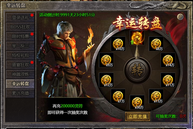 1.活动期间,每充值200000灵符可获得一次抽奖机会,上限10次;