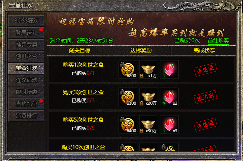 1.活动期间,购买创世宝盒达到一定次数可领取奖励;