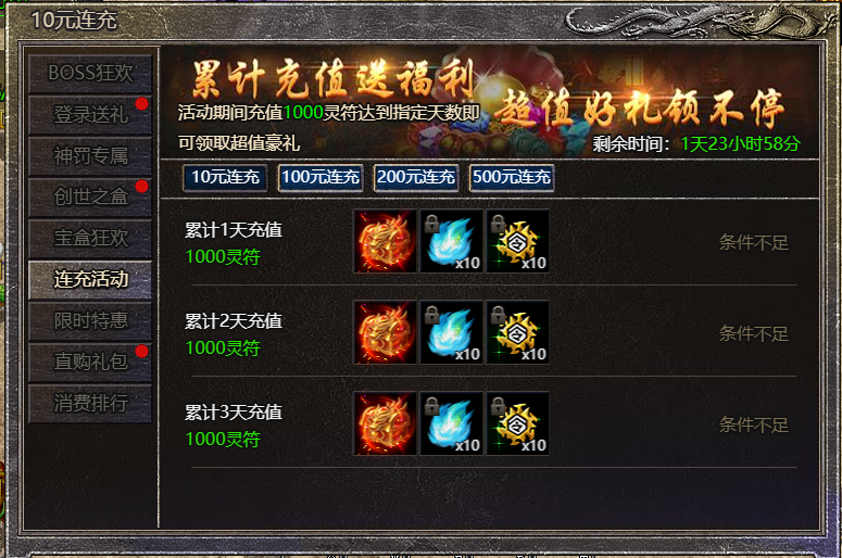 1.活动期间,充值一定的灵符达到指定天数即可领取超值豪礼;