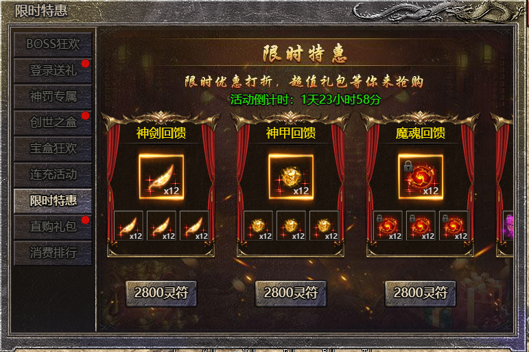 1.活动期间,玩家可在活动面板购买限购礼包,神剑特惠、神甲特惠、魔魂特惠、徽记特惠、经脉特惠、神阶特惠