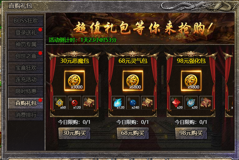 3.活动礼包每天只可购买1次,期间每天重置;