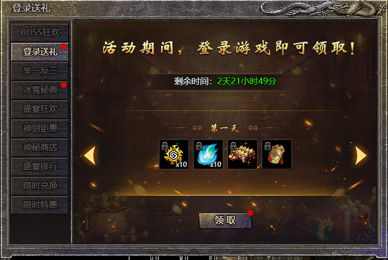 1.活动期间,玩家每天登录游戏,可以在活动界面中领取一份奖励;