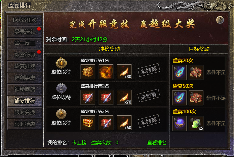 1.活动期间,玩家盛宴次数累计达到指定数量即可参与冲榜;