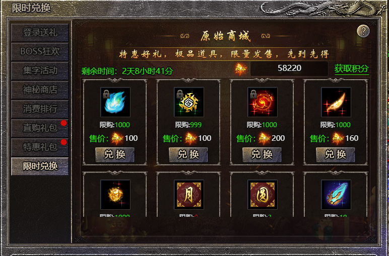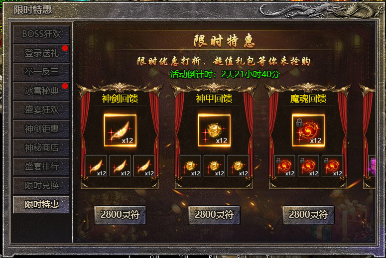 1.活动期间,玩家可在活动面板购买限购礼包,神剑特惠、神甲特惠、魔魂特惠、徽记特惠、经脉特惠、神阶特惠