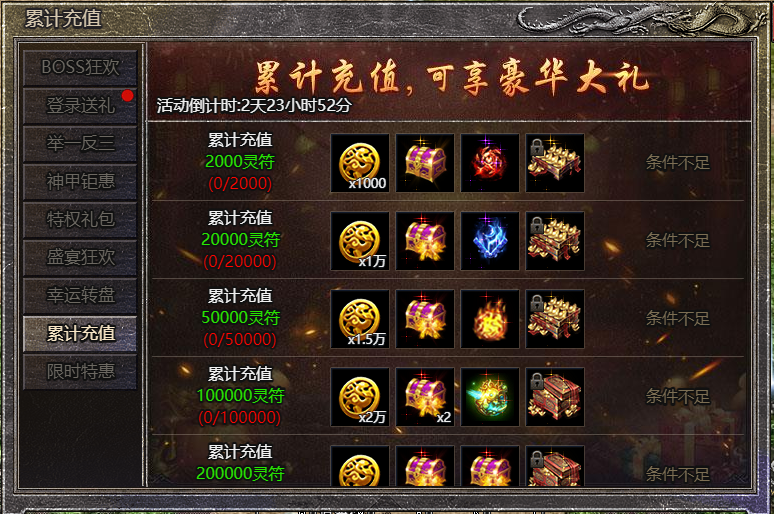 1.活动期间,每充值一定的灵符可领取一份奖励;