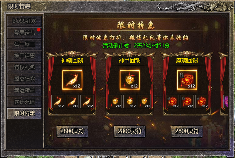 1.活动期间,玩家可在活动面板购买限购礼包,神剑特惠、神甲特惠、魔魂特惠、徽记特惠、经脉特惠、神阶特惠、荒古特惠