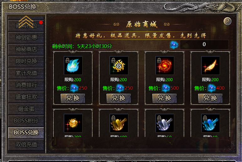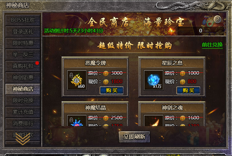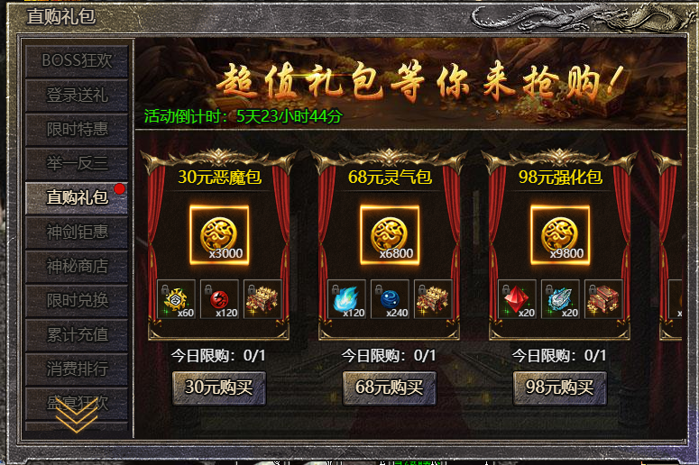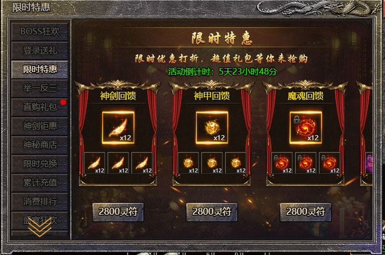 1.活动期间,玩家可在活动面板购买限购礼包,神剑特惠、神甲特惠、魔魂特惠、徽记特惠、经脉特惠、神阶特惠、荒古特惠、蛮王特惠