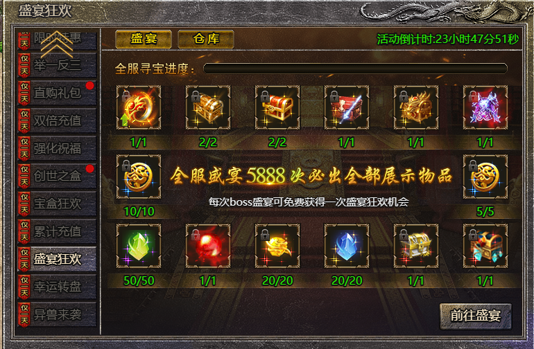 2.达到全服盛宴进度,将必会获得一份展示物品哦!
