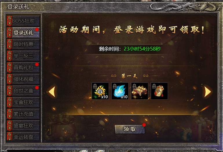 1.活动期间,玩家每天登录游戏,可以在活动界面中领取一份奖励;