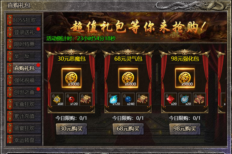 1.活动期间,玩家可在活动面板购买限购礼包,神剑特惠、神甲特惠、魔魂特惠、徽记特惠、经脉特惠、神阶特惠、荒古特惠、蛮王特惠