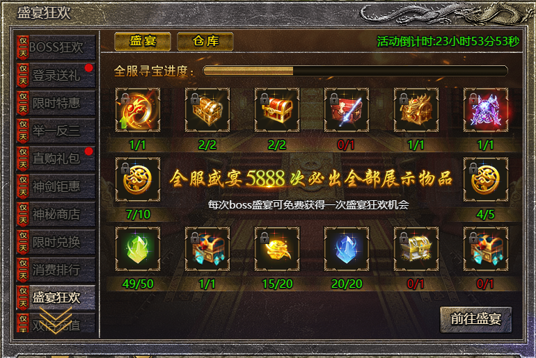 2.达到全服盛宴进度,将必会获得一份展示物品哦!