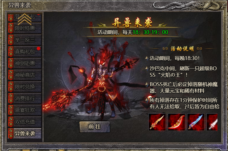 1.活动期间,每晚18:30将在沙巴克中间刷出一只超级BOSS;
