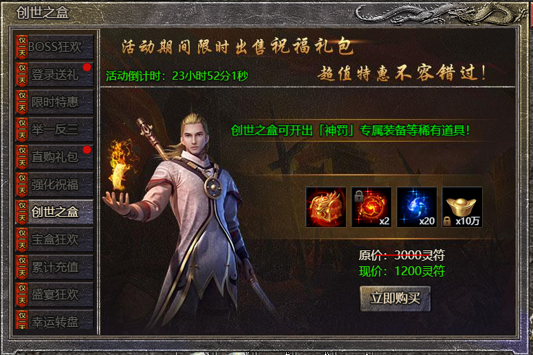 1.活动期间,玩家可在活动面板购买限购礼包,神剑特惠、神甲特惠、魔魂特惠、徽记特惠、经脉特惠、神阶特惠、荒古特惠、蛮王特惠