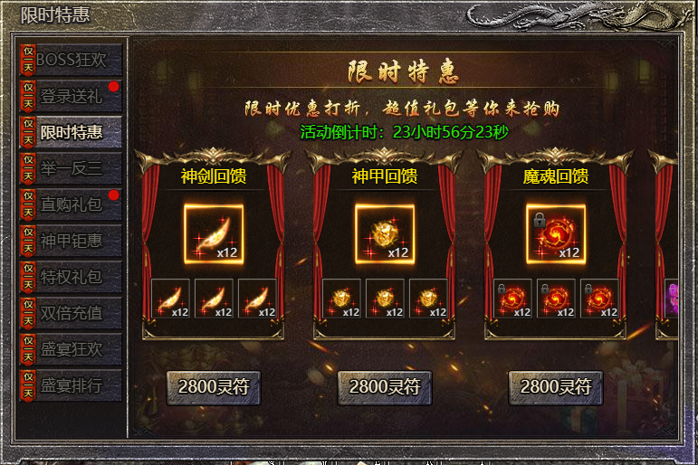 1.活动期间,玩家可在活动面板购买限购礼包,神剑特惠、神甲特惠、魔魂特惠、徽记特惠、经脉特惠、神阶特惠、荒古特惠
