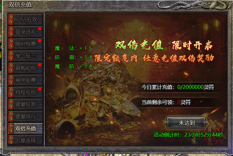 1.活动期间,限定额度内,玩家任意充值,即可领取双倍的灵符奖励