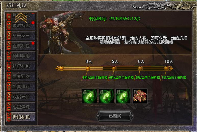 1.全服购买折扣礼包达到一定的人数,即可享受一定的折扣;