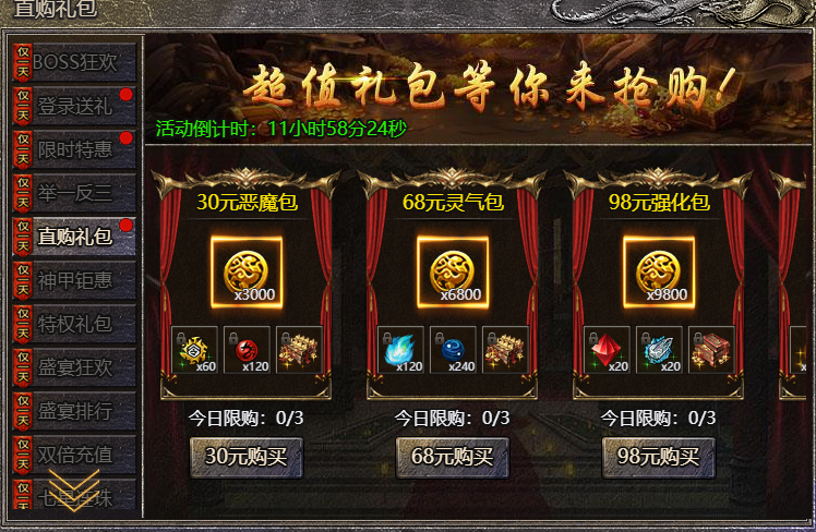 1.活动期间,玩家可在活动面板购买限购礼包,神剑特惠、神甲特惠、魔魂特惠、徽记特惠、经脉特惠、神阶特惠、荒古特惠、蛮王特惠、铭文特惠