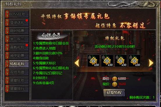1.活动期间,玩家可在活动面板购买限购礼包,拥有对应的赞助特权,才能购买对应的礼包哦