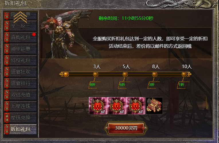 1.全服购买折扣礼包达到一定的人数,即可享受一定的折扣;