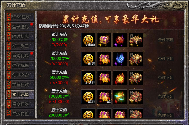 1.活动期间,每充值一定的灵符可领取一份奖励;