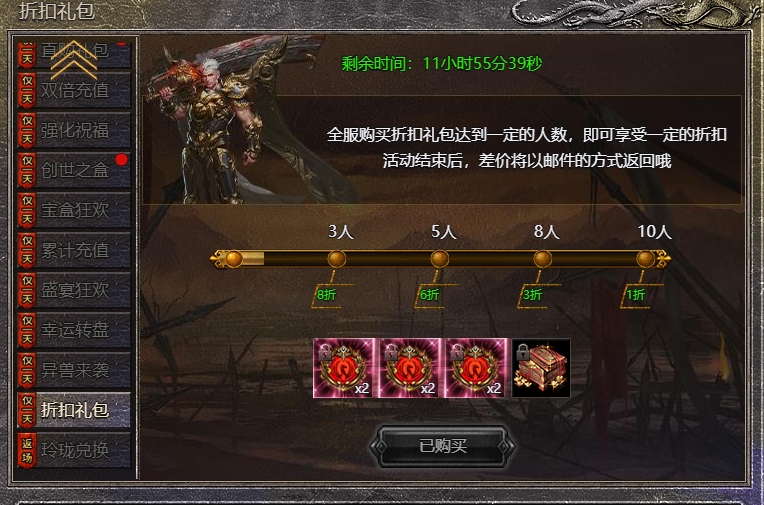 1.全服购买折扣礼包达到一定的人数,即可享受一定的折扣;