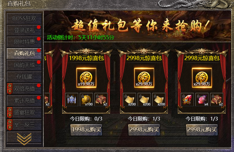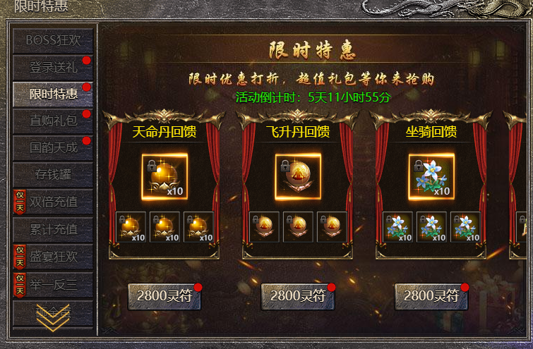 1.活动期间,玩家可在活动面板购买限购礼包,神剑特惠、神甲特惠、魔魂特惠、徽记特惠、经脉特惠、神阶特惠、荒古特惠、蛮王特惠、铭文特惠、坐骑回馈、飞升回馈、天命回馈