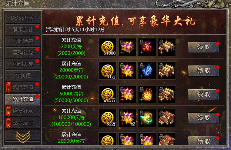 1.活动期间,每充值一定的灵符可领取一份奖励;
