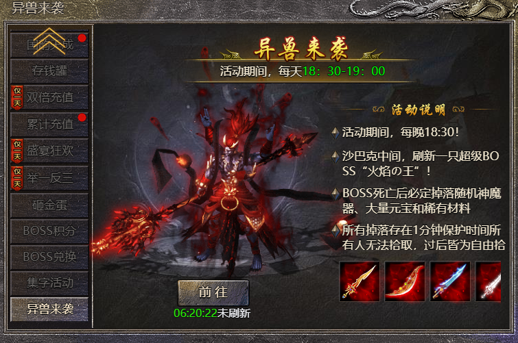 1.活动期间,每晚18:30将在沙巴克中间刷出一只超级BOSS;