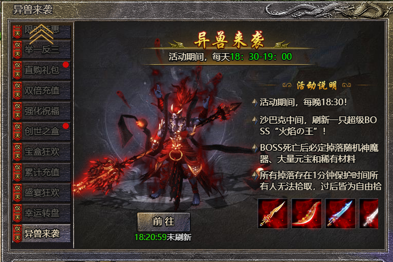 1.活动期间,每晚18:30将在沙巴克中间刷出一只超级BOSS;