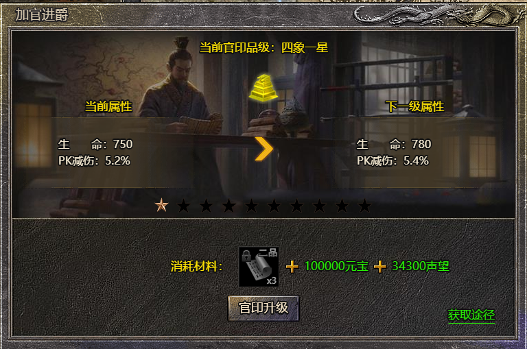 官职等级达一品时,会开启官印,领取专属pk减伤效果