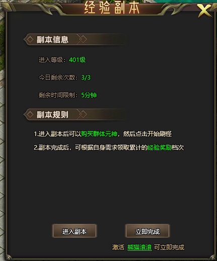 每天可以完成3次经验副本,在经验副本中可以召唤元神助战,击杀怪物越多,结算获得奖励经验越多