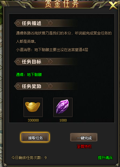 每天可以接取9次赏金任务,赏金任务完成后可获得大量元宝和神兵精华,是每天必做的高价值玩法